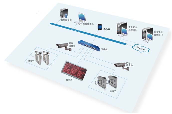 硬件包括:三輥閘(翼閘或擺閘)、考勤機(jī)、LED屏、視頻監(jiān)控?cái)z像頭、電視、手機(jī)等硬件全部連接互聯(lián)網(wǎng)。